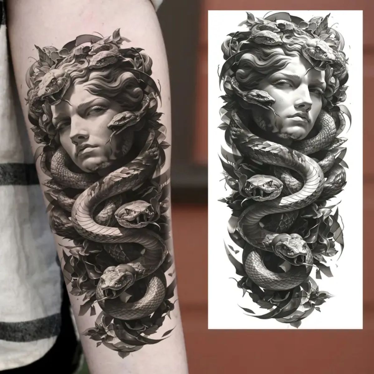 Odkryj siłę i tajemniczość Meduzy dzięki realistycznym tatuażom w formie naklejek na ramię, udo lub nogę! Wodoodporne, trwałe i łatwe w aplikacji i usunięciu, idealne na imprezy, festiwale, plażę i inne wyjątkowe okazje.