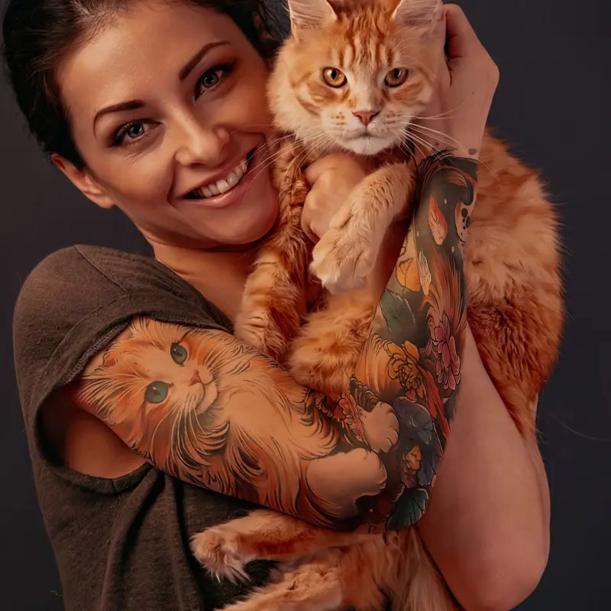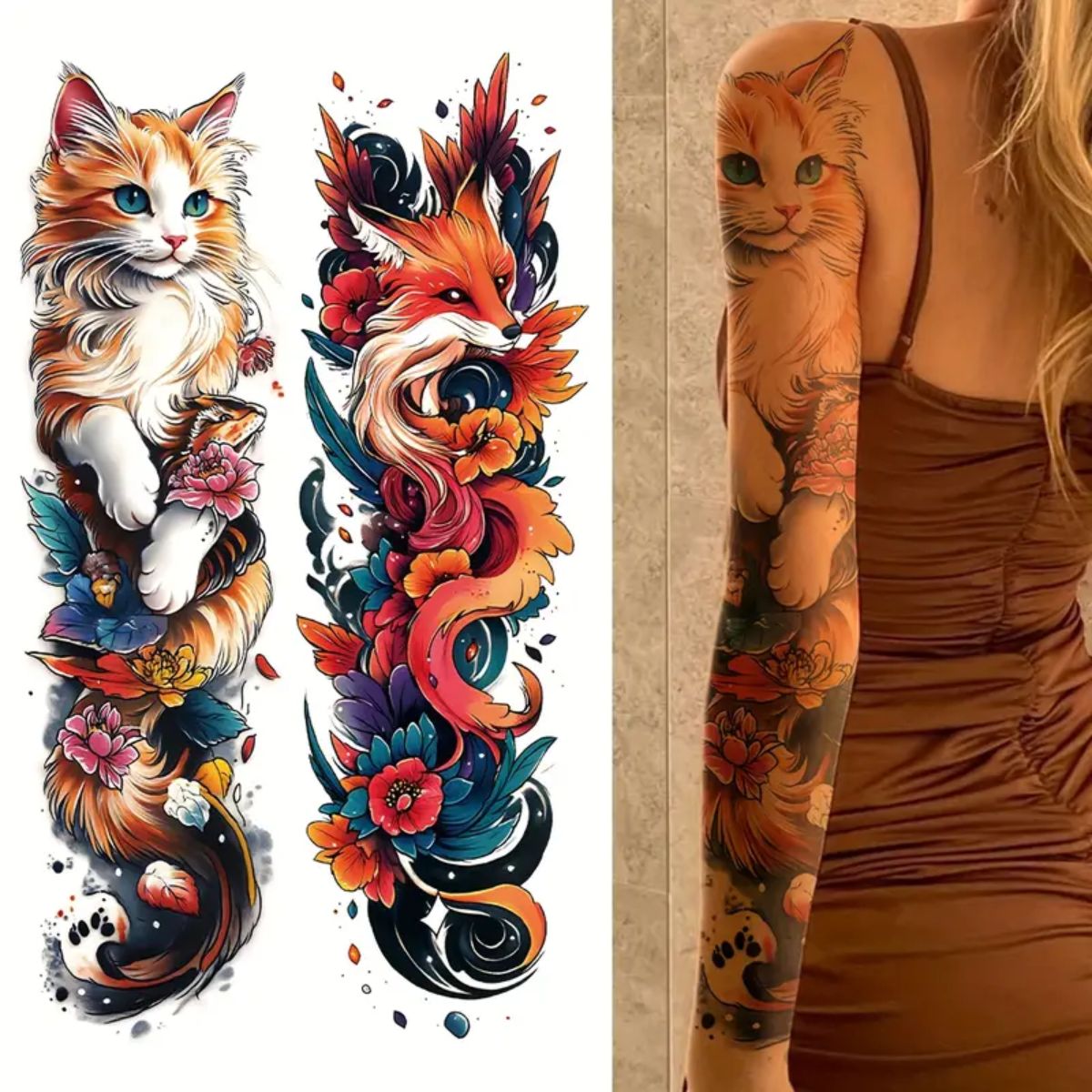 Zaskocz wszystkich wyjątkowym stylem dzięki tatuażom tymczasowym w formie dużego rękawa z motywem kota i lisa. Wzory w stylu akwarelowym 3D tworzą efekt prawdziwego dzieła sztuki na Twojej skórze.