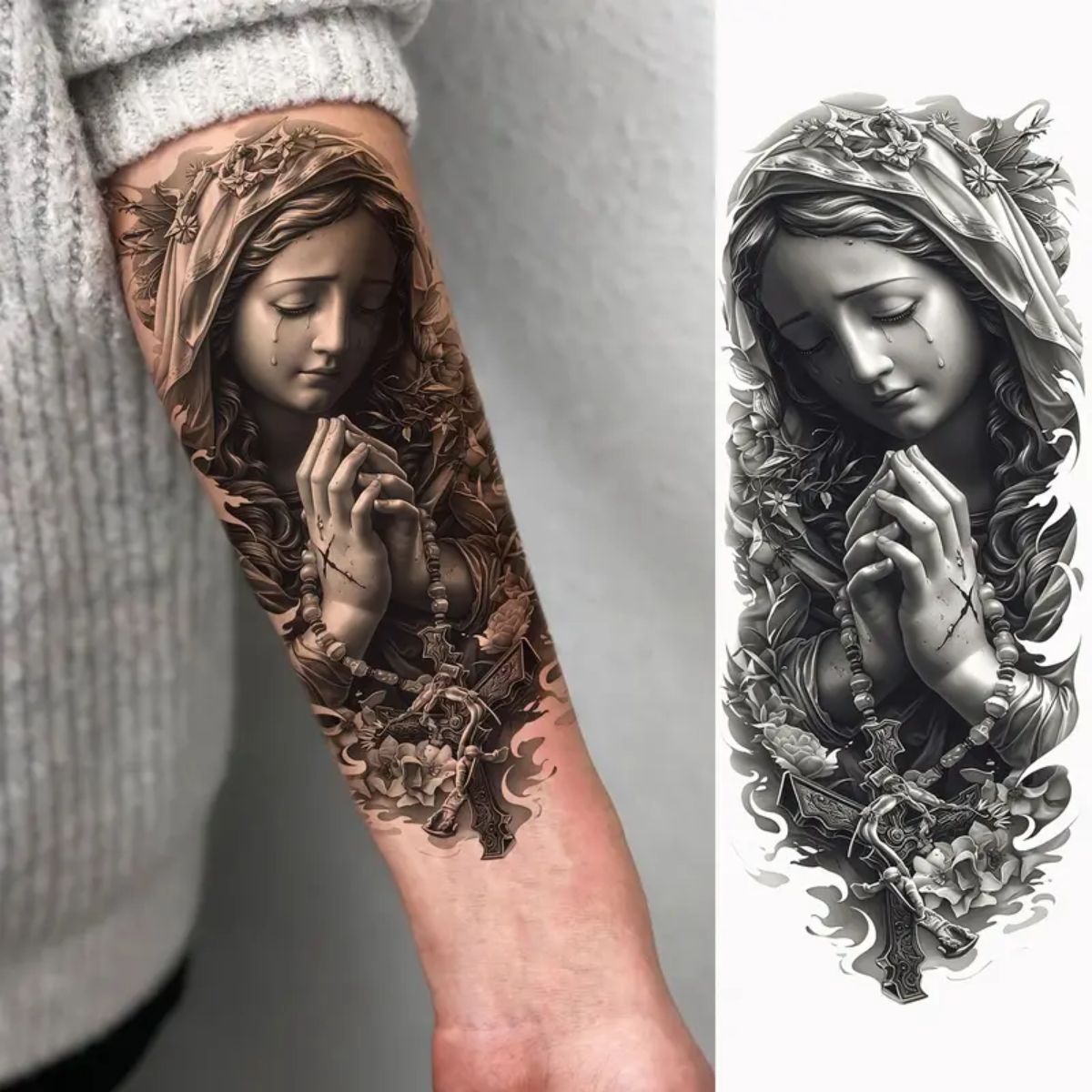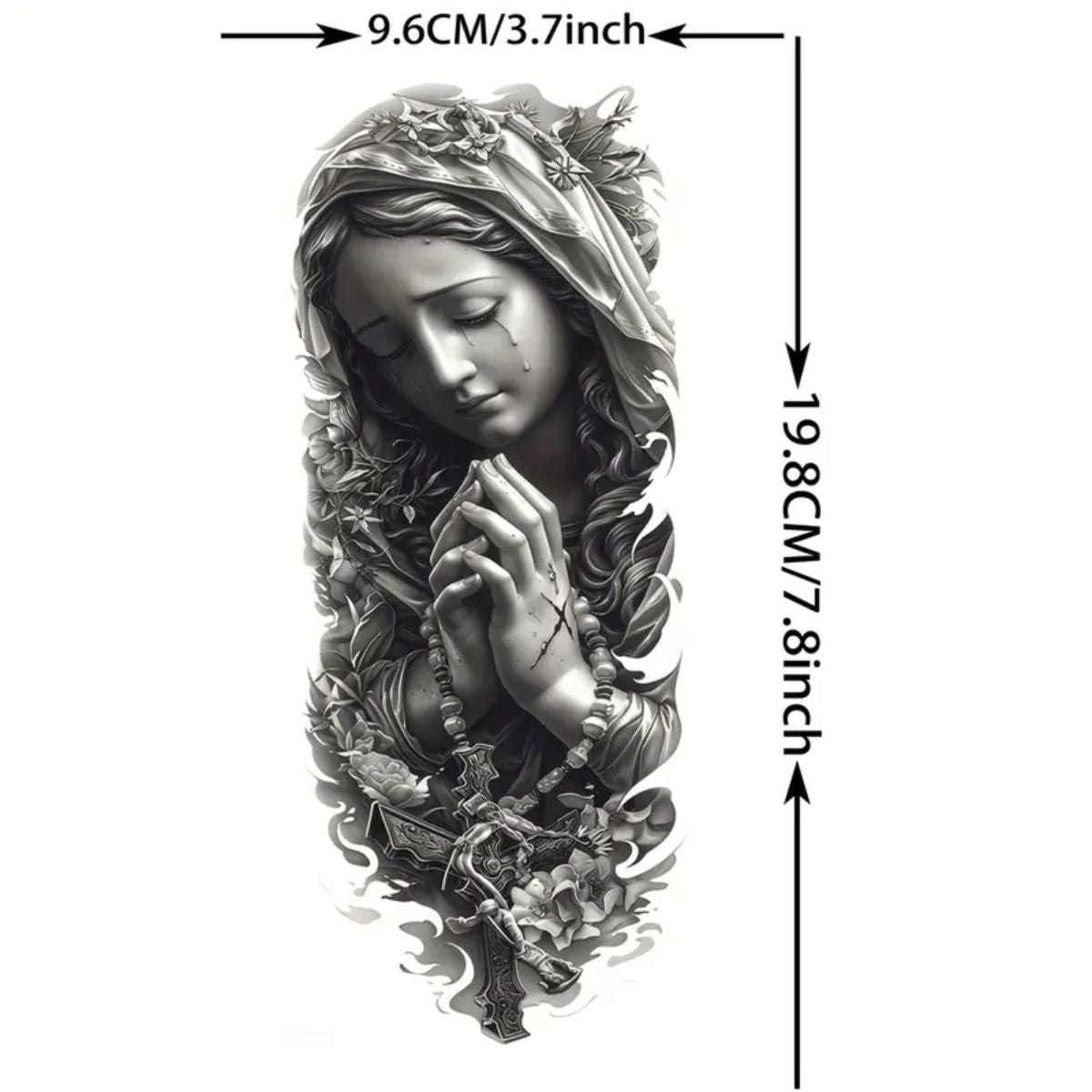 Dodaj duchowego charakteru swojej stylizacji dzięki realistycznym tatuażom tymczasowym z motywem Matki Boskiej i krzyża. To nie tylko ozdoba, ale również symbol wiary, ochrony i siły wewnętrznej.