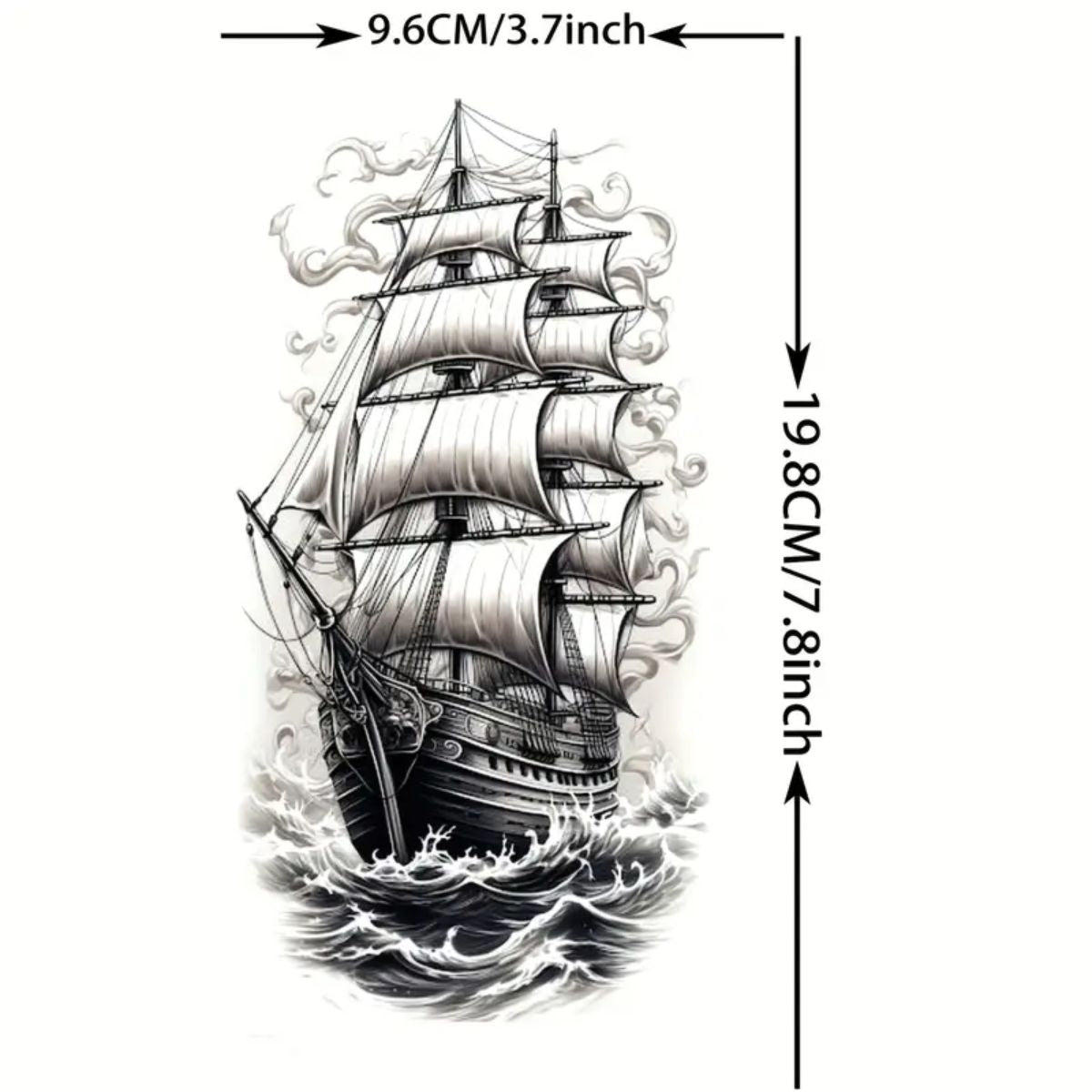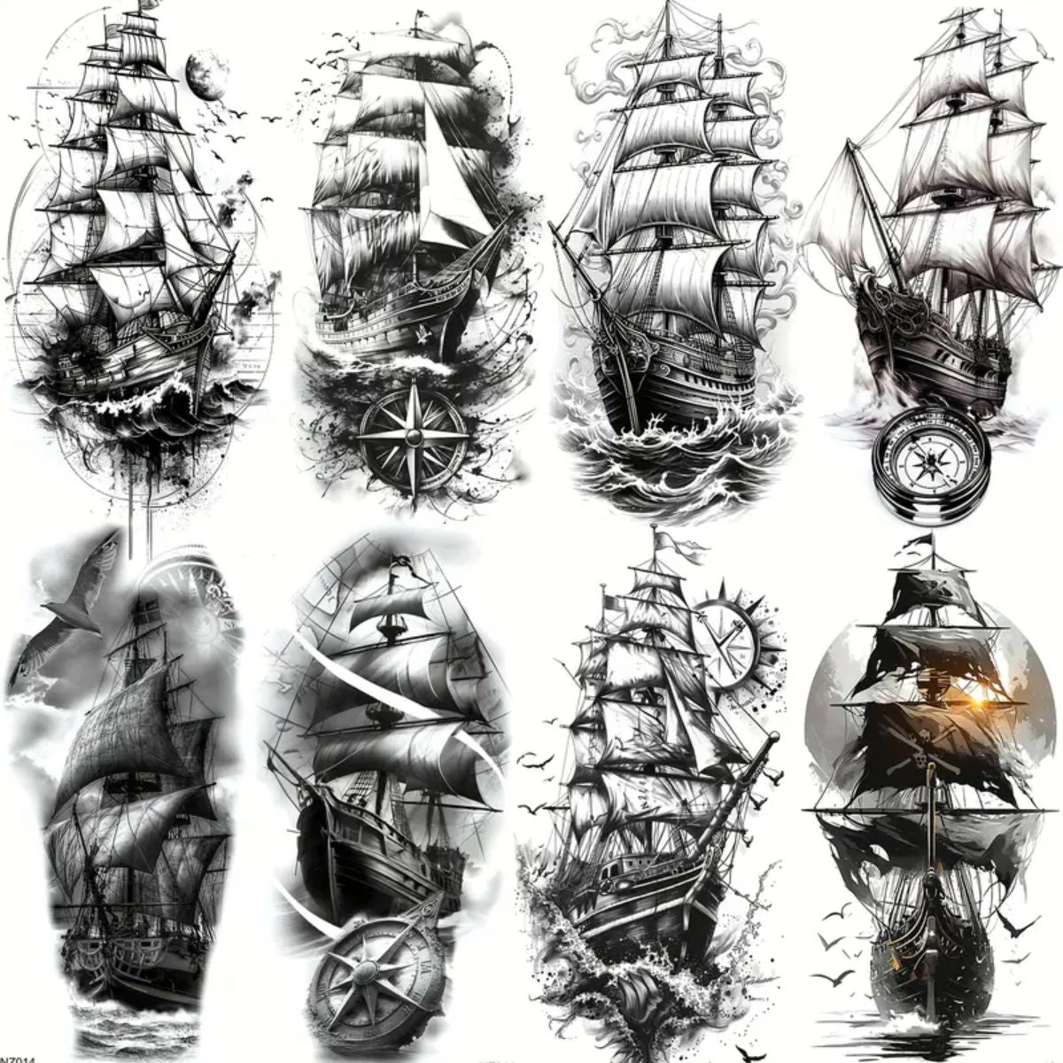 Zestaw 8 Tatuaży – Starożytne Okręty i Fale, Realistyczne Tatuaże dla Mężczyzn i Kobiet